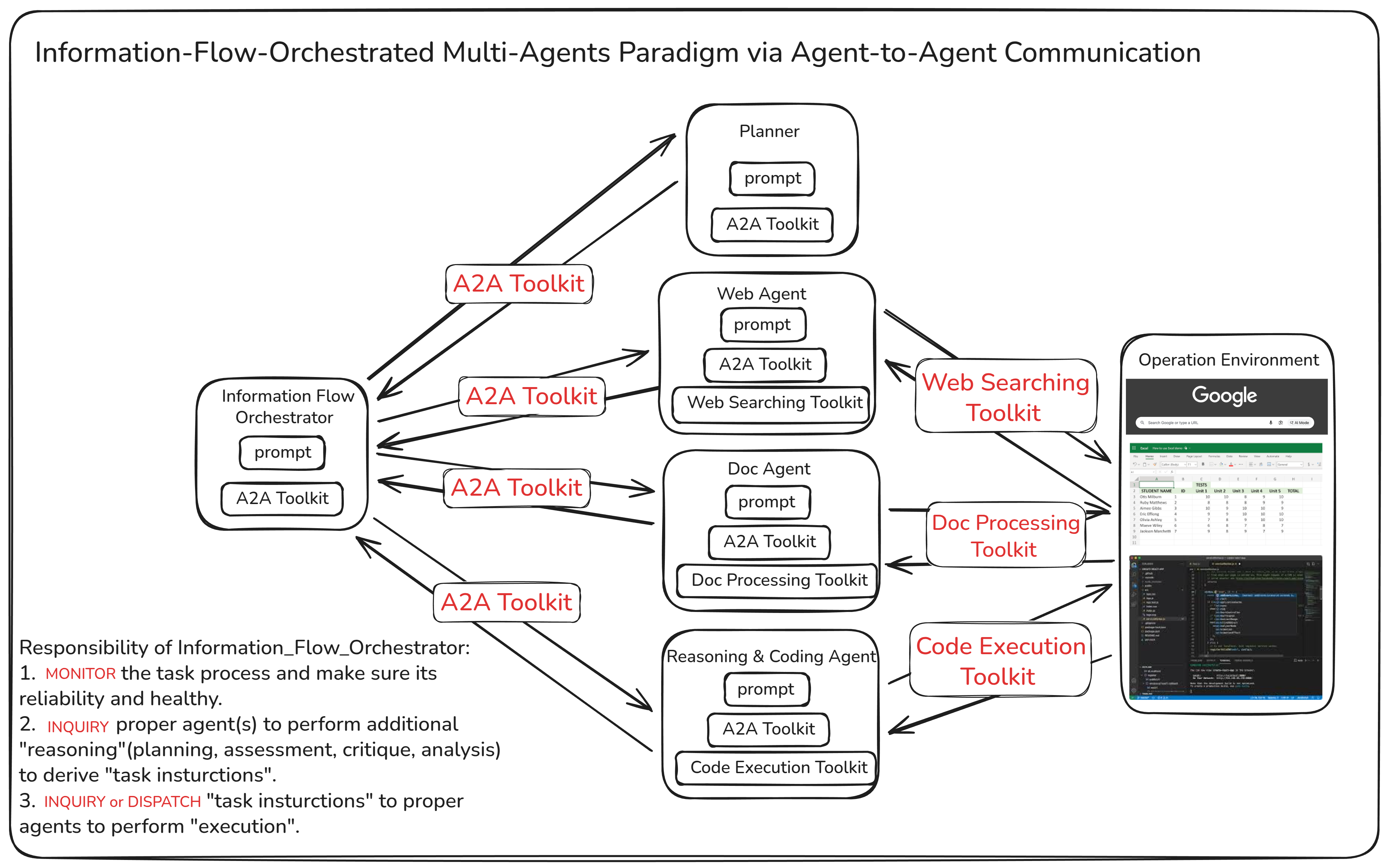 An information-flow-orchestrated paradigm with a dedicated orchestrator coordinating agents via A2A; on GAIA it achieves 63.64% pass@1 accuracy, outperforming OWL by 8.49 points with comparable token consumption.